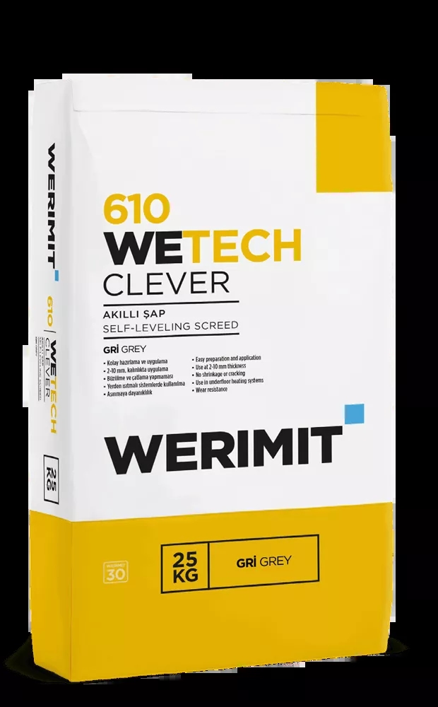 • Dry mortar in a 25 kg WERIMIT WETECH-CLEVER (Self-Leveling Screed) bag is poured into