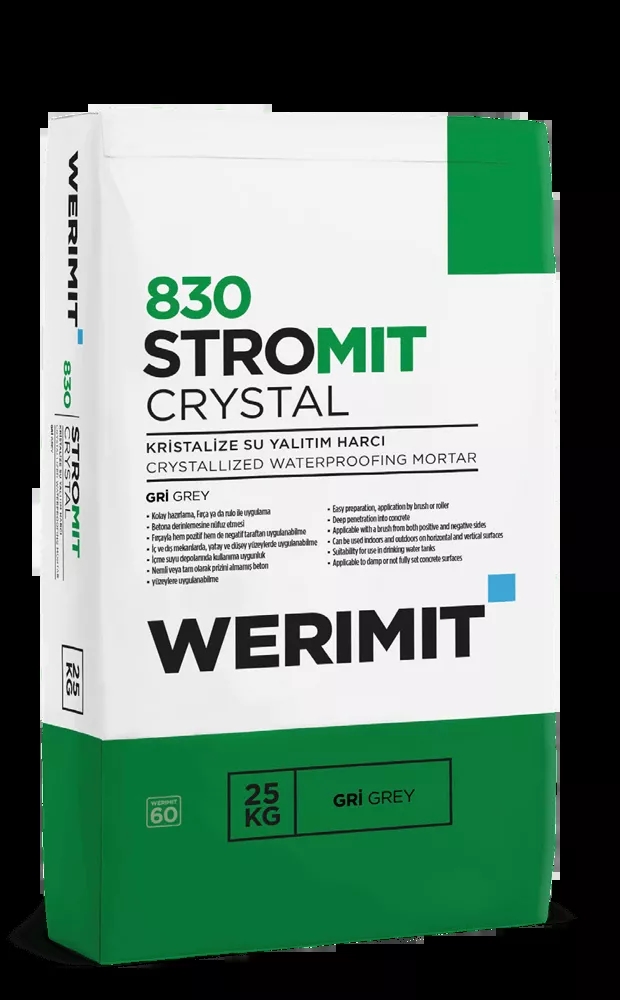 • 25kg WERIMIT STROMIT-CRYSTAL (Crystallized Waterproofing Mortar) should be poured slowly onto 6.5-7.5 liters of water and mixed with a low-speed mixer until a homogeneous mixture is obtained.