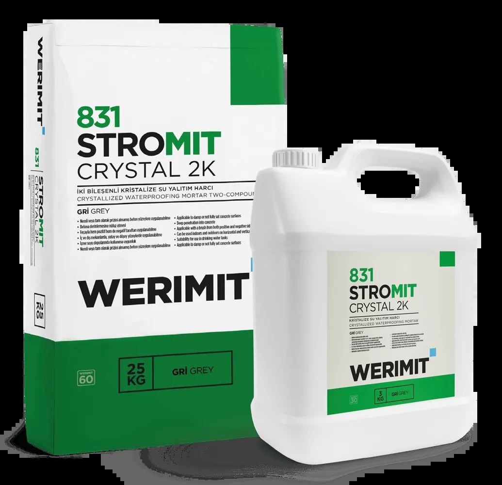 •B component (3 kg component and 5-5.5 lt. water) is put into a mixing bowl then, during continuous mixing, 25 Kg of WERIMIT STROMIT-CRYSTAL 2K (Crystallized Waterproofing Mortar Two-Compound) is added to component A and mixed with a low- speed mixer until a homogeneous mixture is obtained (approximately 3 minutes).