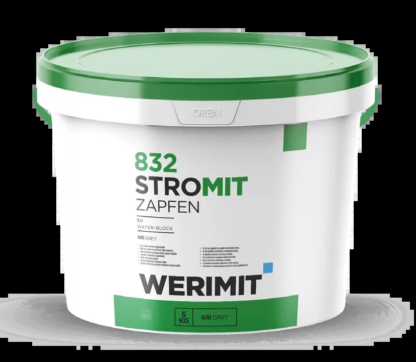 • 5 kg WERIMIT STROMIT-ZAPFEN (Water Plugging Mortar) should be mixed with 1.2-1.4 liters of clean water and pugged. The resulting paste-like mortar should be used without waiting. The mortar is made into a conical shape by hand and placed under pressure in the area where the water leakage is located, and it is waited until the water leakage is stopped, then the surface is quickly smoothed with a trowel after the material solidifies.